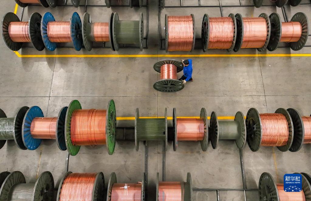 2月1日,在四川遂寧市蓬溪經(jīng)開區(qū)一電纜生產(chǎn)車間,工人在趕制訂單(無(wú)人機(jī)照片)。