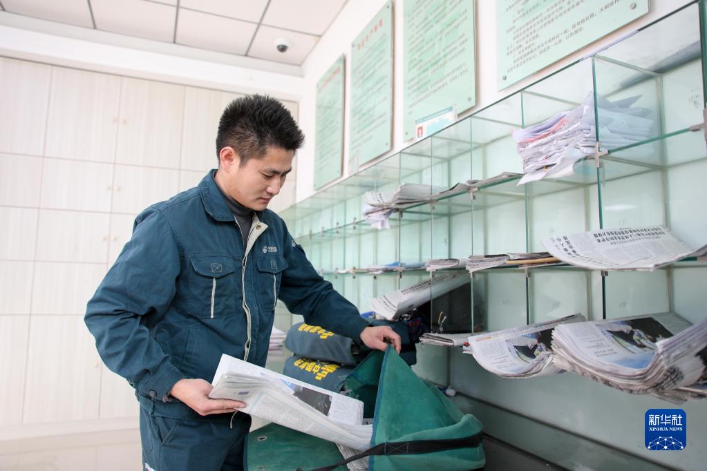 2月1日,謝菲俊將分揀好的報刊等郵件裝進郵包。