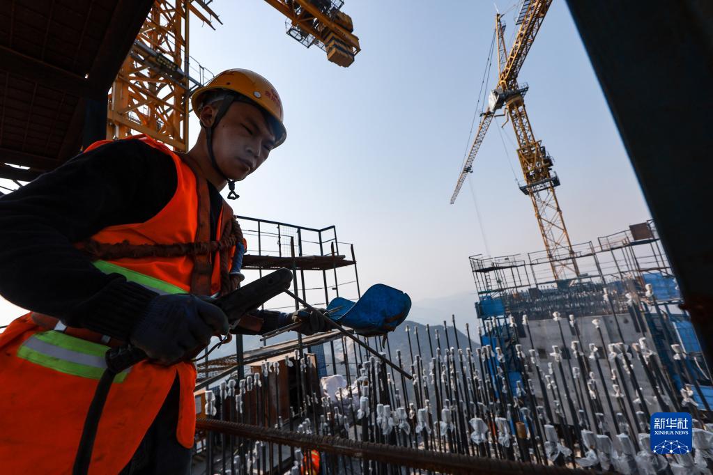2月1日,施工人員在花江峽谷大橋主塔上施工。