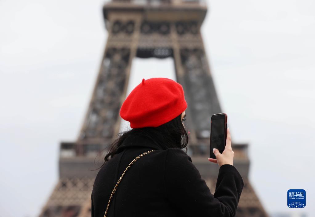 2月1日,一名游客在法國巴黎埃菲爾鐵塔附近的特羅卡德羅廣場參觀。