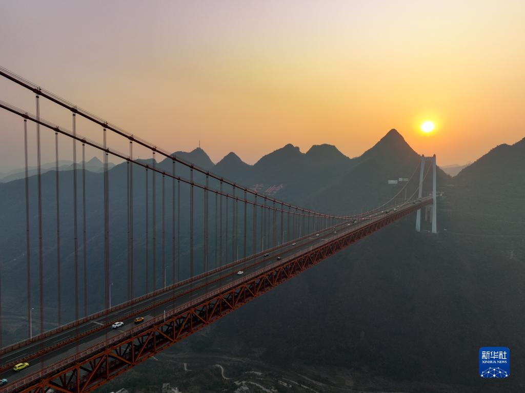當日,貴州壩陵河大橋沐浴在夕陽余暉下,美不勝收。