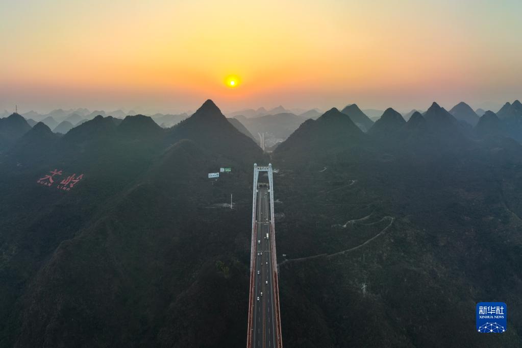 當日,貴州壩陵河大橋沐浴在夕陽余暉下,美不勝收。
