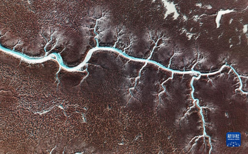 近日,在遼寧盤錦遼河口濕地,海水在潮汐作用下涌入遼河口濕地的潮溝,并凝結成冰,從高空看去,宛若蜿蜒曲折、形態各異的“冰脈”。