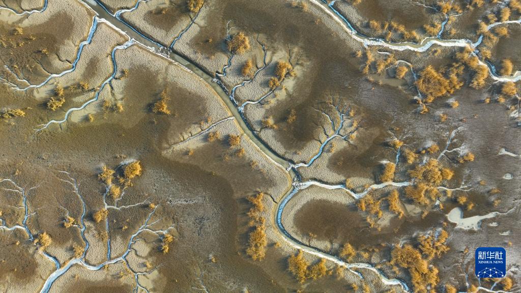 近日,在遼寧盤錦遼河口濕地,海水在潮汐作用下涌入遼河口濕地的潮溝,并凝結成冰,從高空看去,宛若蜿蜒曲折、形態各異的“冰脈”。