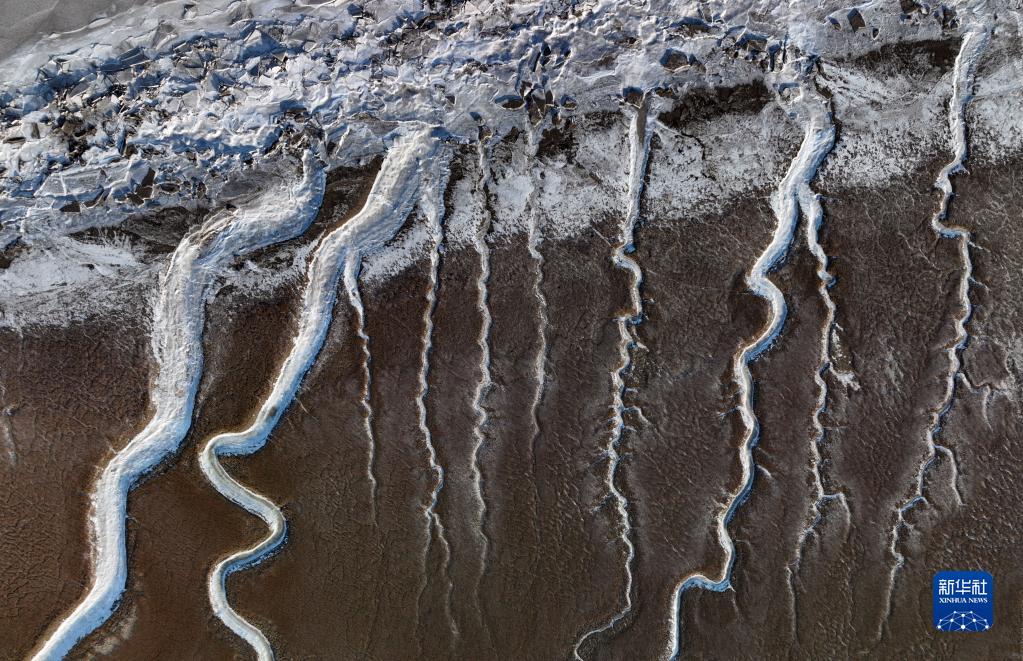 近日,在遼寧盤錦遼河口濕地,海水在潮汐作用下涌入遼河口濕地的潮溝,并凝結成冰,從高空看去,宛若蜿蜒曲折、形態各異的“冰脈”。