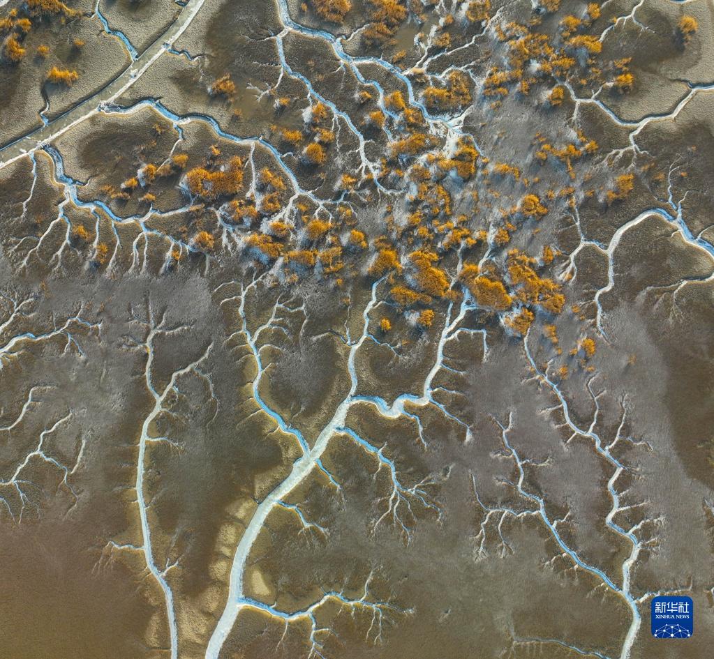 近日,在遼寧盤錦遼河口濕地,海水在潮汐作用下涌入遼河口濕地的潮溝,并凝結成冰,從高空看去,宛若蜿蜒曲折、形態(tài)各異的“冰脈”。
