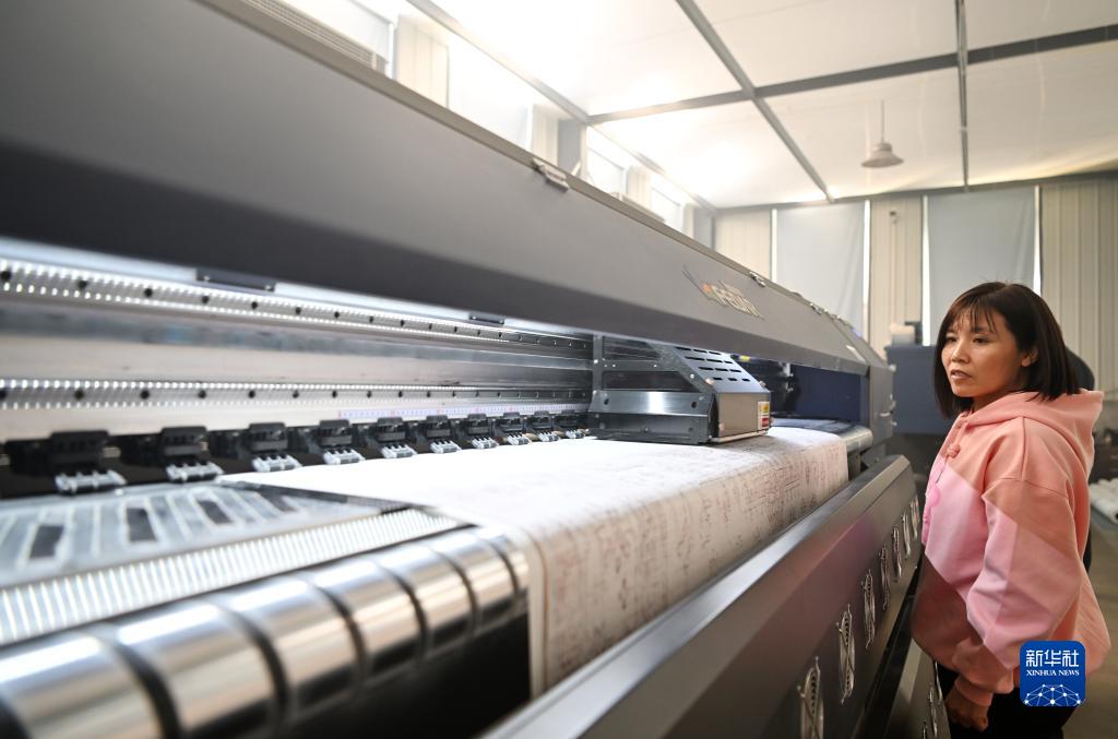 在天津市武清區(qū)崔黃口鎮(zhèn)凱利地毯有限公司,工人在查看地毯印花機(jī)的運(yùn)行情況(2月1日攝)。