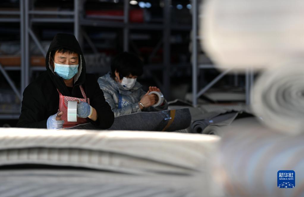 在天津市武清區(qū)崔黃口鎮(zhèn)凱利地毯有限公司,工人打包地毯(2月1日攝)。