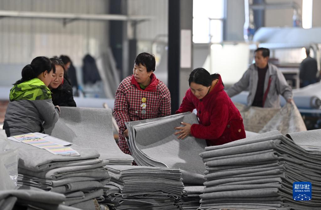 在天津市武清區崔黃口鎮凱利地毯有限公司,工人搬運地毯(2月1日攝)。