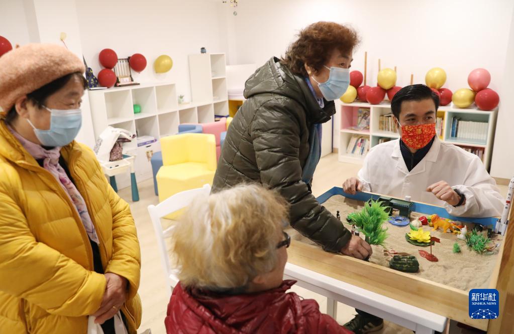 2月2日,一位心理醫生(右)在沙盤游戲中協助居民選取道具。