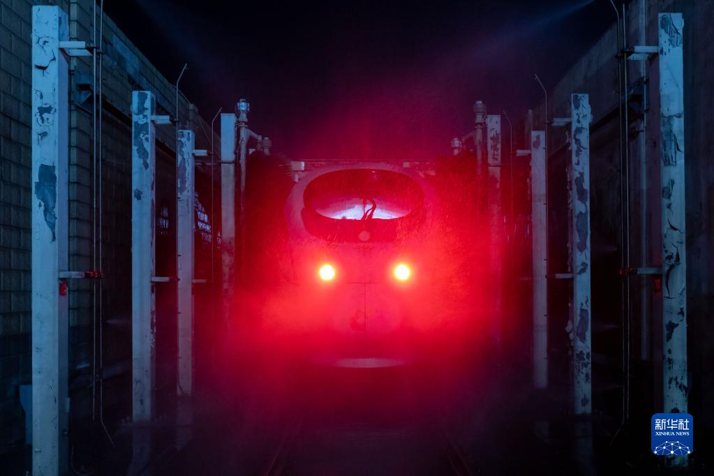 2月1日凌晨0時許,在南翔動車運用所,DJ7716次高鐵確認列車在入庫前進行機械化清洗作業。