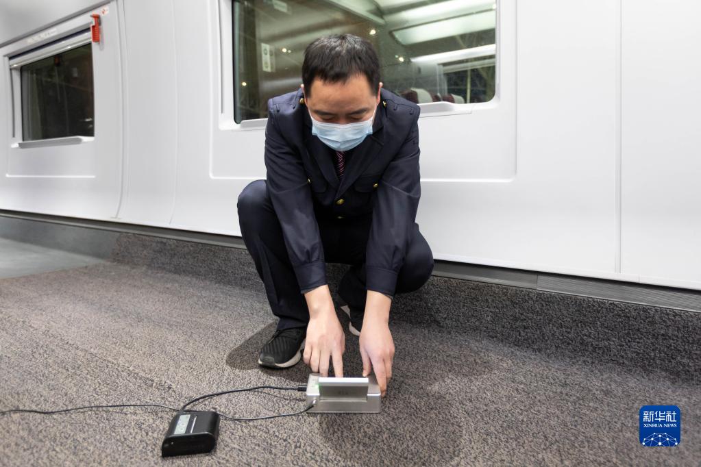 2月1日凌晨5時許,上海高鐵基礎設施段添乘班班長陳曉華在DJ7716次高鐵確認列車上布設便攜式添乘儀,了解列車平穩運行程度。