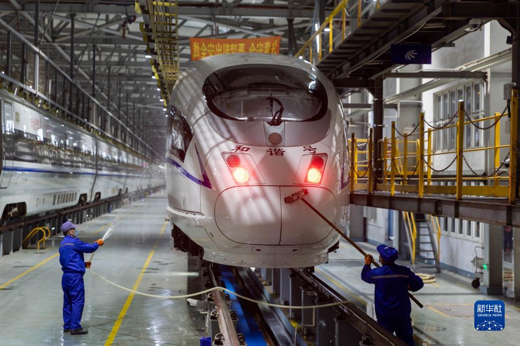 2月1日凌晨1時許,上海動車段工作人員清洗入庫南翔動車運用所的DJ7716次高鐵確認列車。