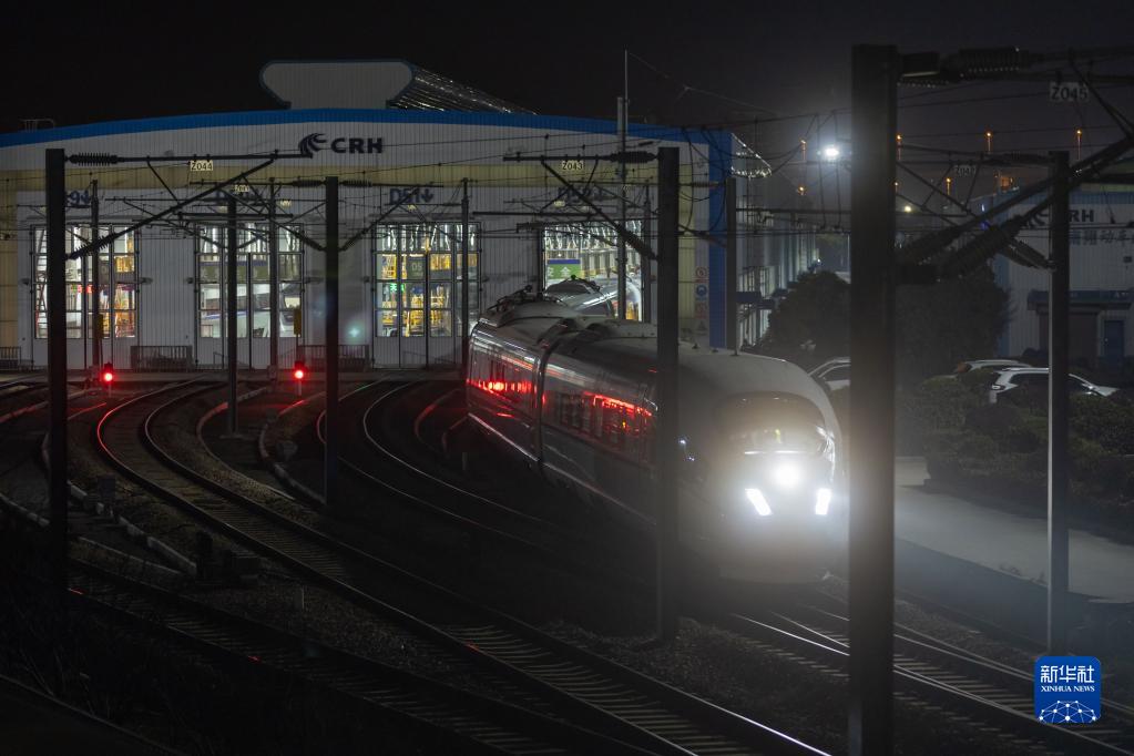 2月1日凌晨3時許,DJ7716次高鐵確認列車在完成庫內檢修和清洗作業后,從南翔動車運用所庫內緩緩駛出,準備前往存車線進行發車準備。