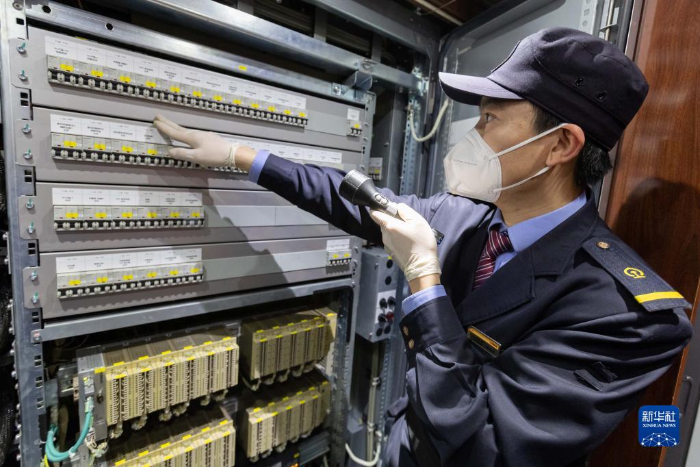 2月1日凌晨5時許,上海動車段隨車機械師吳家樂檢查DJ7716次高鐵確認列車電氣柜。