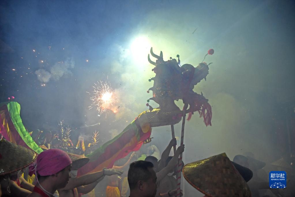 人們?cè)趶V西南寧市賓陽縣縣城舞炮龍(2月1日攝)。