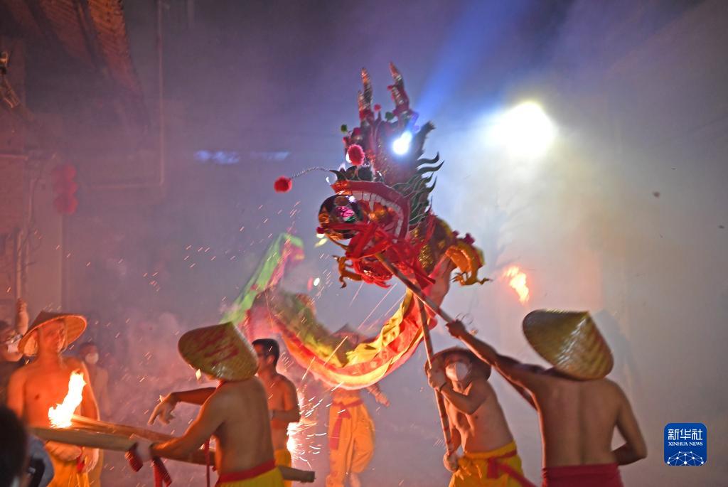 人們在廣西南寧市賓陽縣縣城舞炮龍(2月1日攝)。
