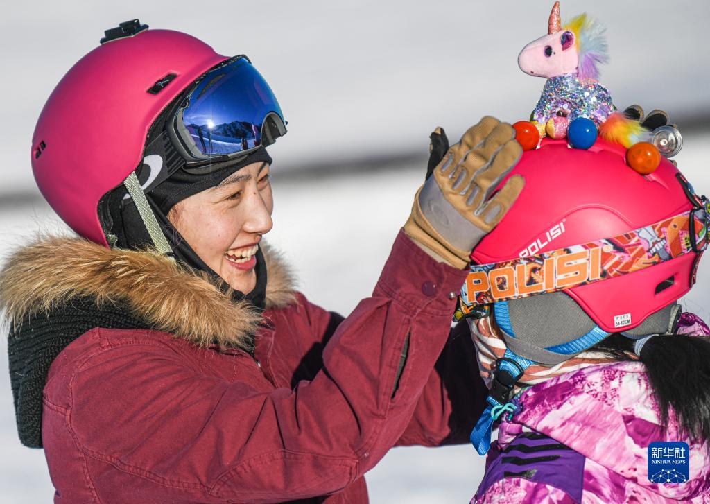 在新疆白云國際滑雪場,許秀娟(左)幫小學(xué)員整理頭盔(2021年1月27日攝)。