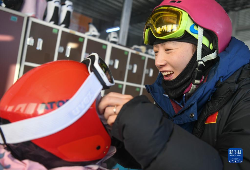 在新疆白云國際滑雪場,許秀娟(右)給小學員儲宥善整理頭盔和雪鏡(1月26日攝)。