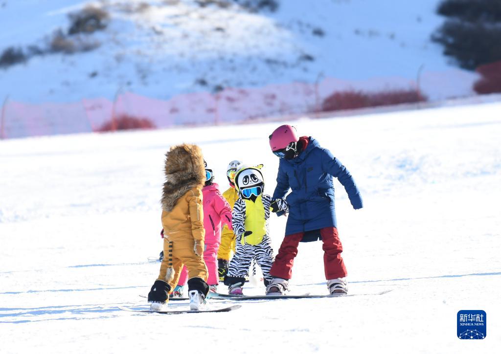 在新疆白云國際滑雪場,許秀娟(右一)在為前來參加免費公開課的小學員們講解單板滑雪技巧(2021年12月21日攝)。