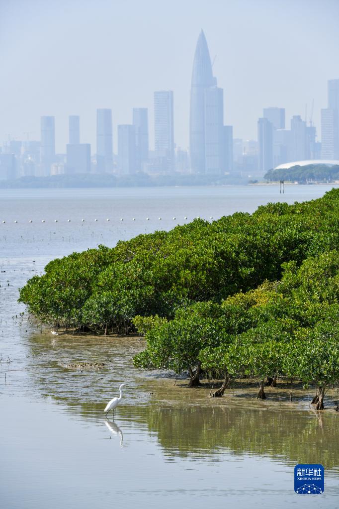 在深圳,紅樹林濕地與城市的高樓大廈形成人與自然和諧相處的景象(2022年12月7日攝)。