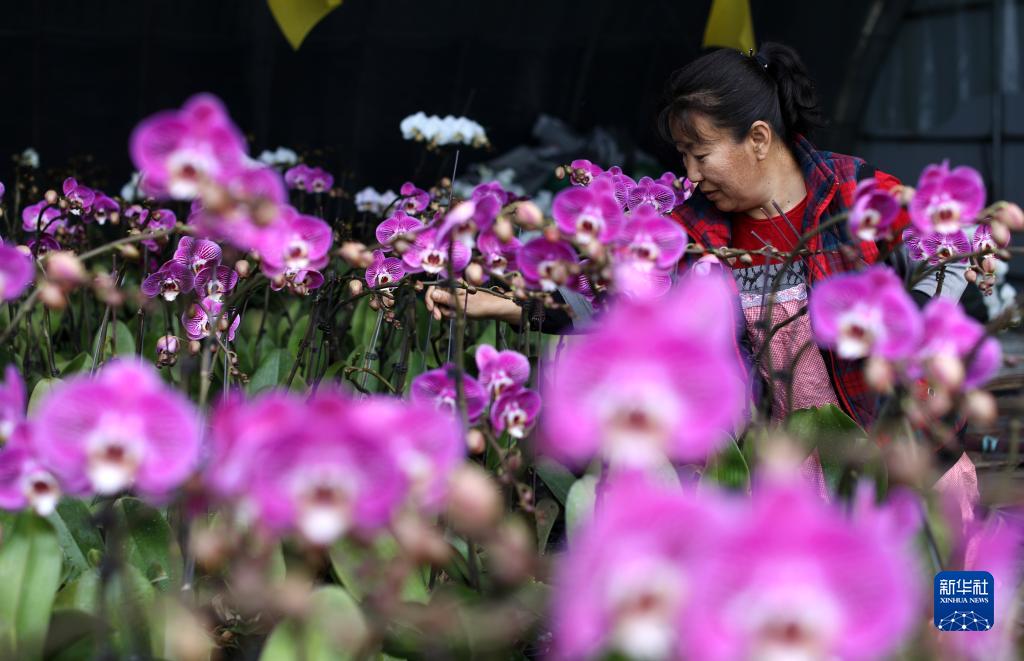2月1日,沈陽市十里河街道花卉基地一位花農在大棚內對蝴蝶蘭進行花間管理。