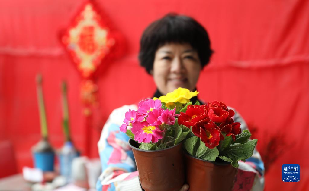 2月1日,沈陽市十里河街道花卉基地一位花農在大棚內展示她家銷售的報春花。