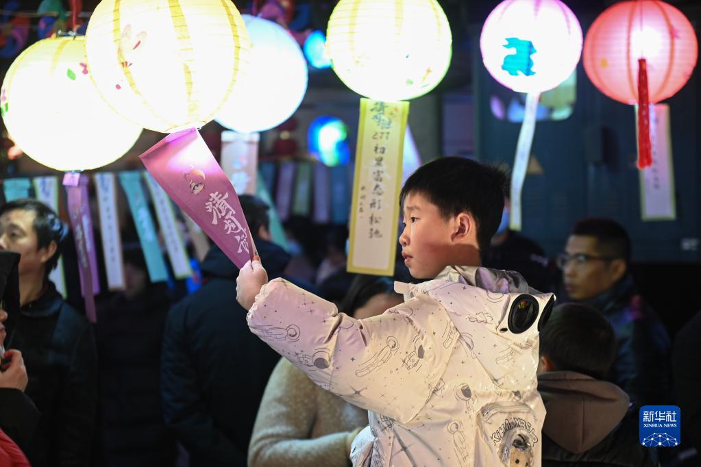 2月2日,小朋友在浙江省湖州市南潯區(qū)菱湖鎮(zhèn)在古鎮(zhèn)景區(qū)猜燈謎。