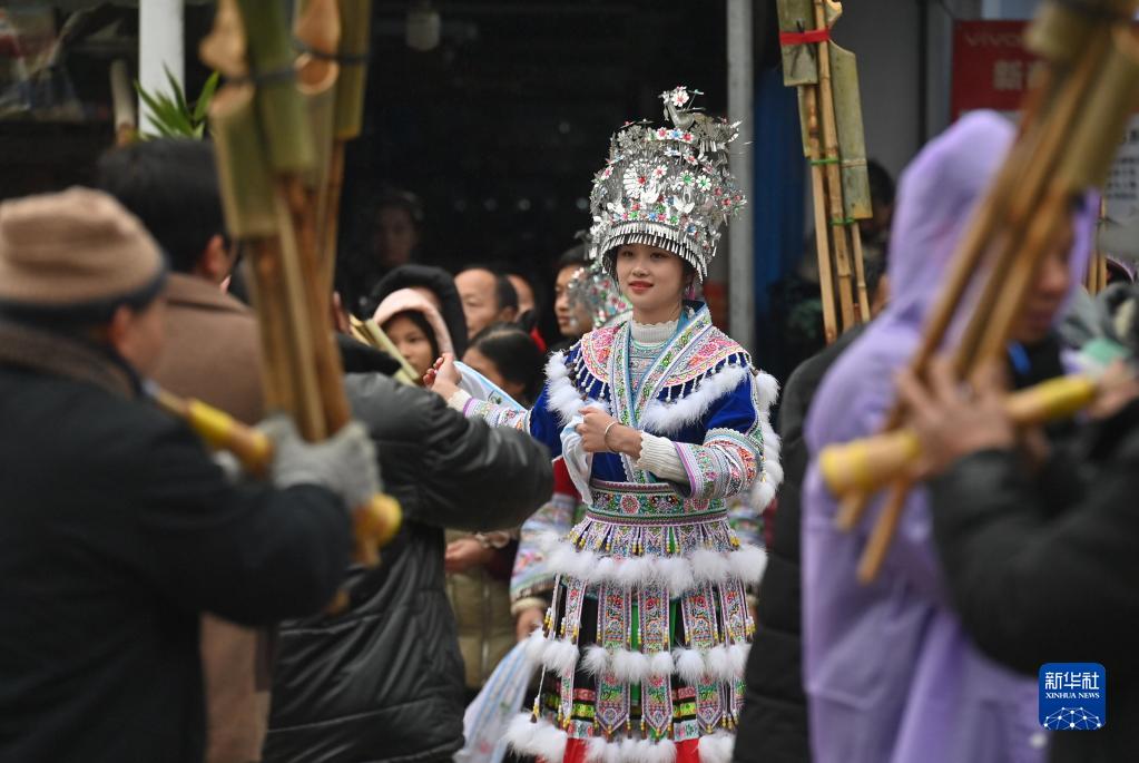2月2日,融水苗族自治縣桿洞鄉苗族姑娘在跳苗舞。