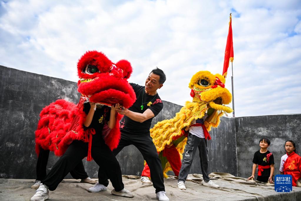 2月2日,在廣西興業縣石南鎮東周村,教練在傳授舞獅的基本功。