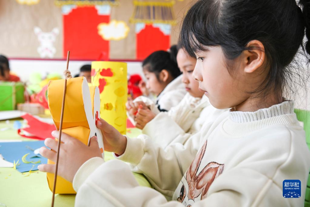 2月2日,在廣西興業(yè)縣城南小學(xué),學(xué)生們在制作元宵節(jié)的花燈。