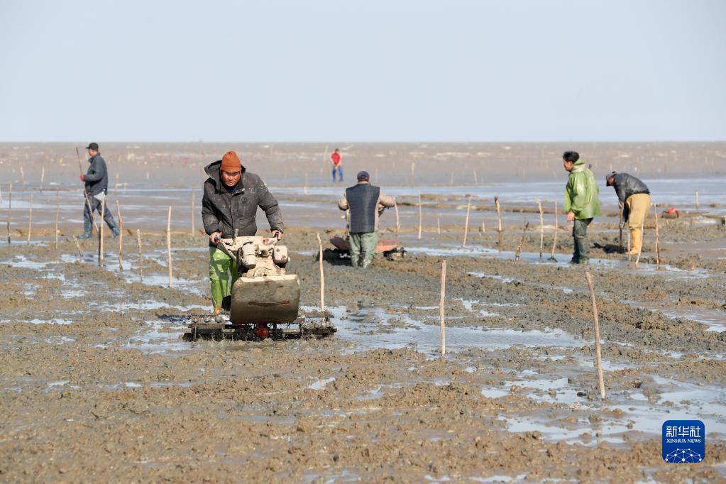 2月2日,福州瑯岐島漁民在翻耕灘涂播種蟶苗。