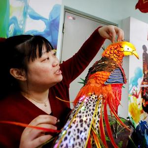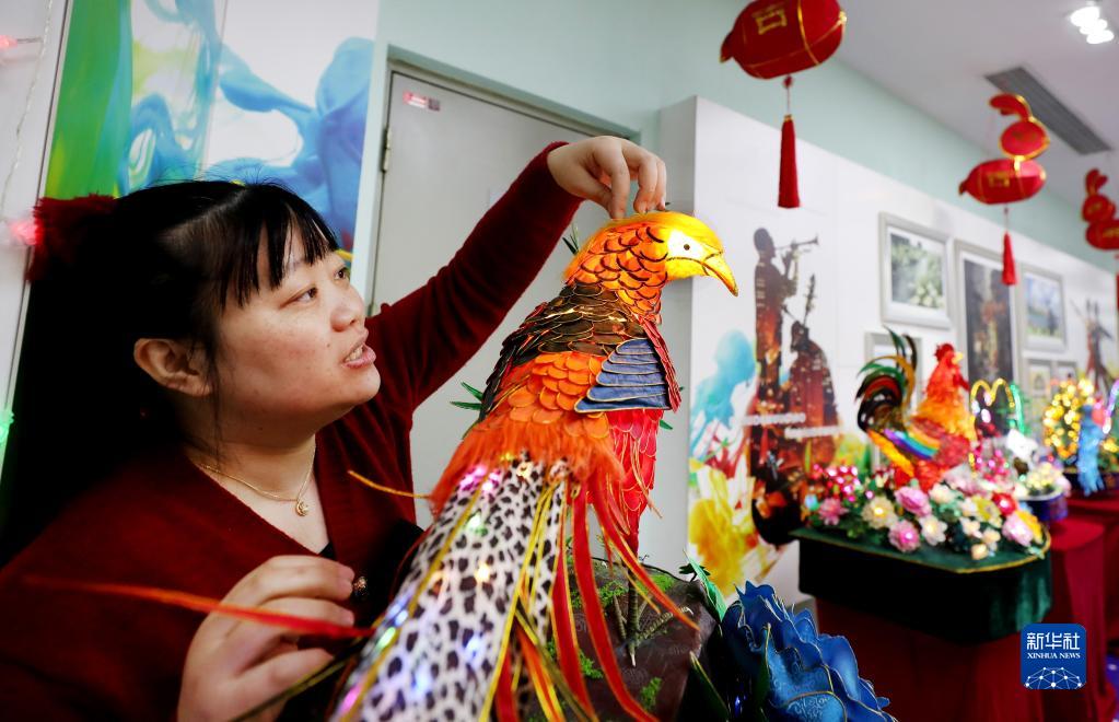 2月1日,龔智瑜整理“紅腹錦雞”造型燈彩。