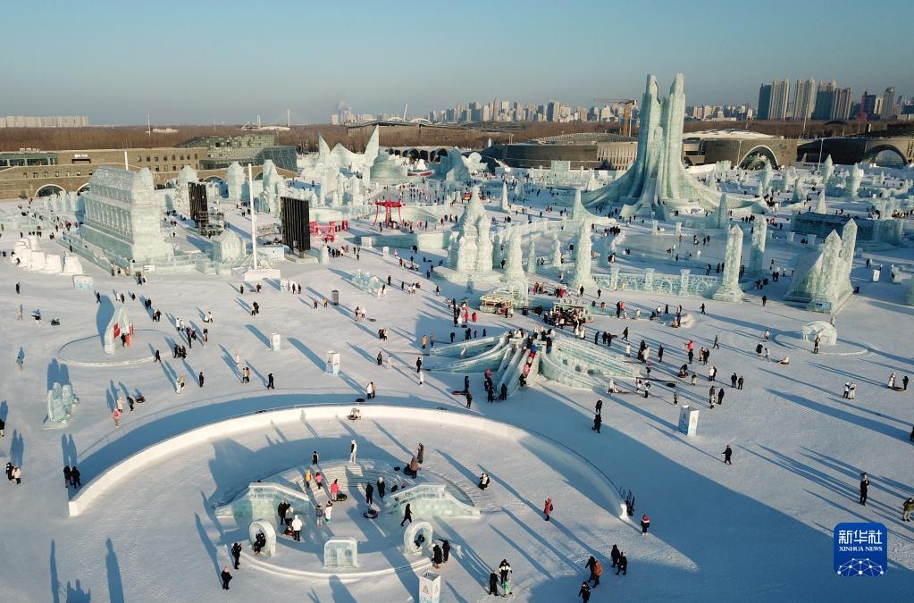 2月2日,游客在哈爾濱冰雪大世界園區(qū)內(nèi)游玩(無(wú)人機(jī)照片)。