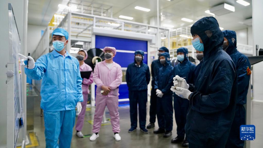 江西國軒新能源科技有限公司實習員工周詩航(右一)在廠房內參加涂布輥分專項會議(2月2日攝)。