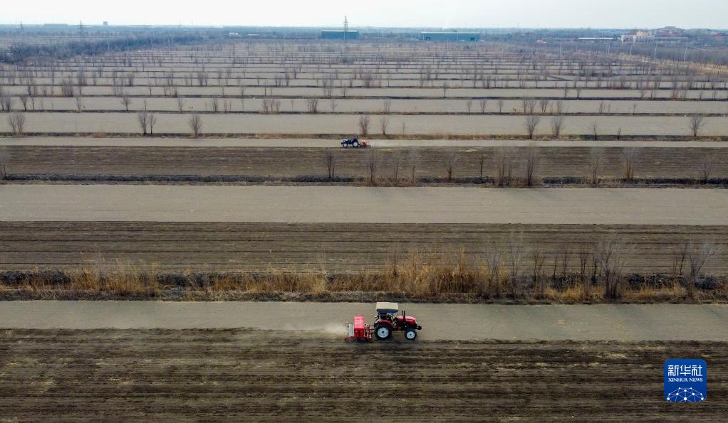 2月2日,工人在位于天津市靜海區蔡公莊鎮的天津市農業科學院農作物研究所示范基地操作機器播種春小麥原種(無人機照片)。