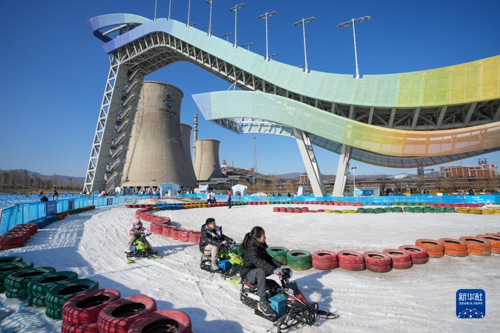 游客在首鋼滑雪大跳臺下的“首鋼園冰雪匯”體驗雪上游樂項目(1月31日攝)。