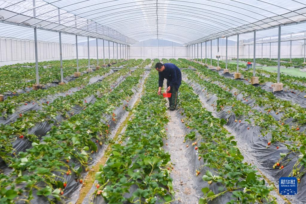 在位于杭州市富陽區銀湖街道唐家塢村的杭州榮發農業科技發展有限公司的生態溫室大棚內,工作人員在采摘草莓(2月1日攝)。