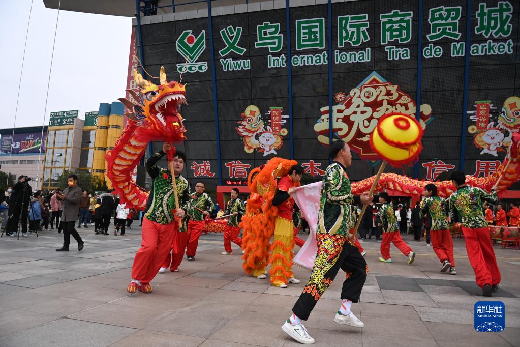 舞龍隊在義烏國際商貿城門口的廣場表演,迎接商貿城兔年開市(2月2日攝)。