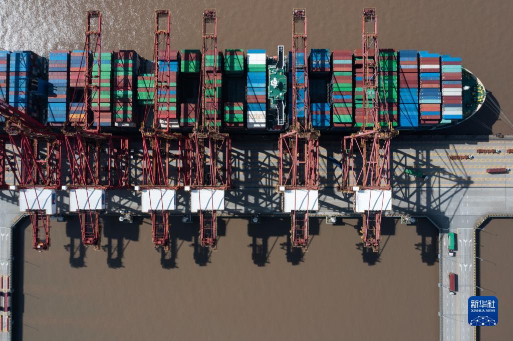 在寧波舟山港金塘港區(qū)大浦口集裝箱碼頭上,一艘外籍貨輪正在靠泊卸貨(1月31日攝,無人機照片)。2022年寧波舟山港完成年貨物吞吐量超12.5億噸,連續(xù)14年位居全球第一;完成集裝箱吞吐量3335萬標準箱,位居全球第三。