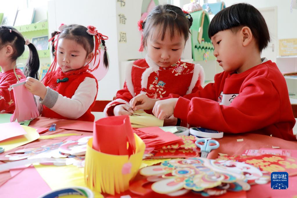 2月3日,山東省青島西海岸新區濱海新村幼兒園小朋友在制作燈籠。