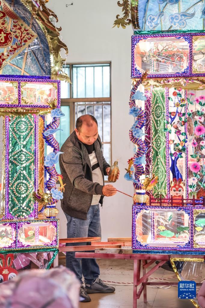 2月2日,海南省瓊海市龍江鎮南正村村民在制作花燈。