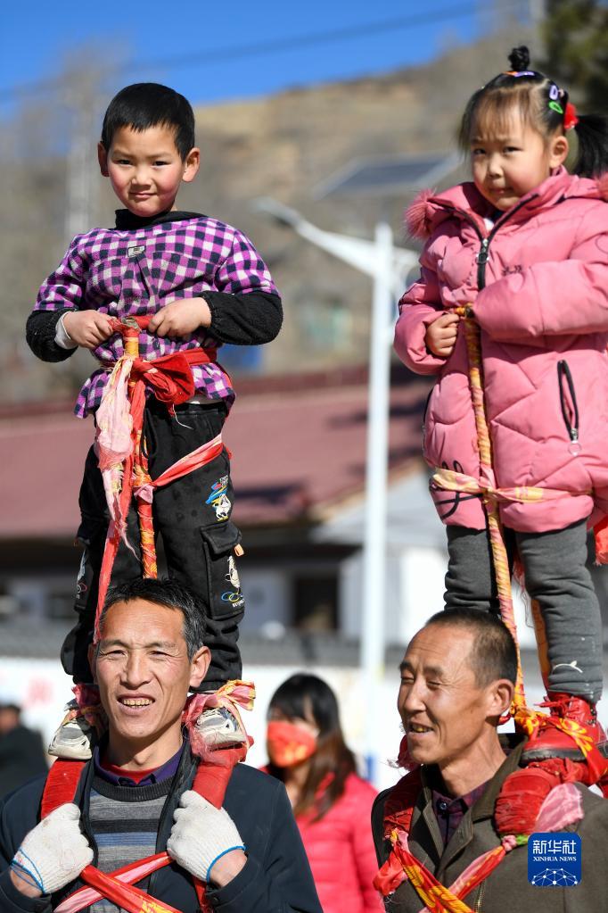 2月3日,寧夏固原市隆德縣觀莊鄉陽洼村村民在排練扛社火。扛社火是由身強力壯的成年男子肩扛起年齡較小的孩子,扮演成各種不同的戲曲人物,在行走中進行表演,是社火演出的一種形式。