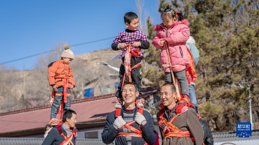 2月3日,寧夏固原市隆德縣觀莊鄉陽洼村村民在排練扛社火。扛社火是由身強力壯的成年男子肩扛起年齡較小的孩子,扮演成各種不同的戲曲人物,在行走中進行表演,是社火演出的一種形式。