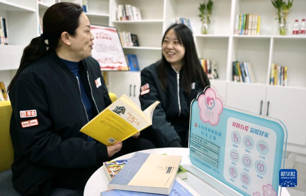 2月2日,從事網約車工作的張金梅(左)在豐臺區南苑街道黨群服務中心的“驛港灣”和同事看書聊天。