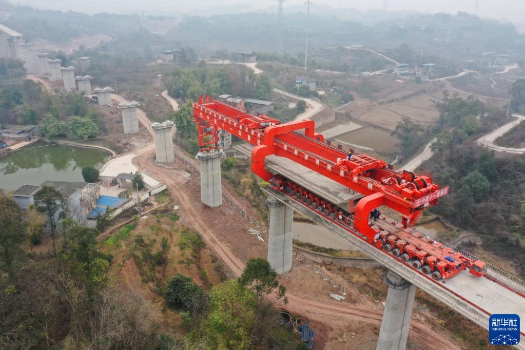 當天,在由中鐵十一局集團承建的渝昆高鐵川渝段站前一標建設施工現場,830噸大型箱梁在鴨子堡特大橋成功架設,標志著渝昆高鐵重慶段實現節后全面復工復產。