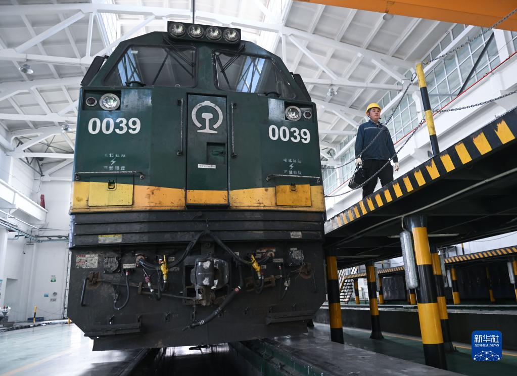 2月4日,在格爾木機務段檢修車間,馬國仁在巡檢機車。