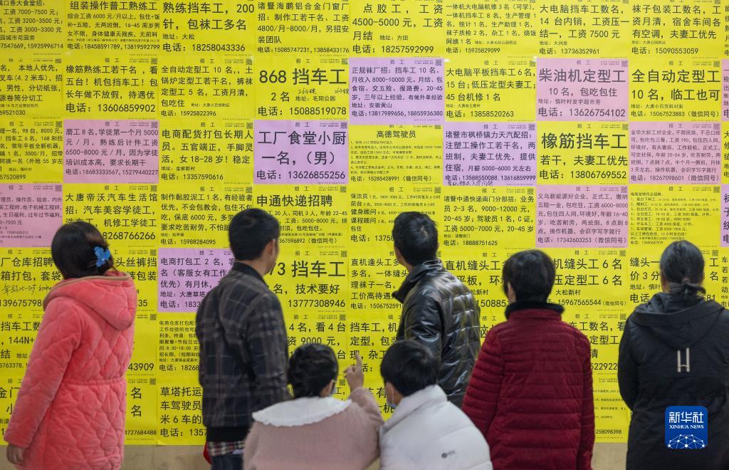 2月1日,外來(lái)務(wù)工者在浙江省諸暨市大唐街道勞動(dòng)力市場(chǎng)內(nèi)查看招工信息。