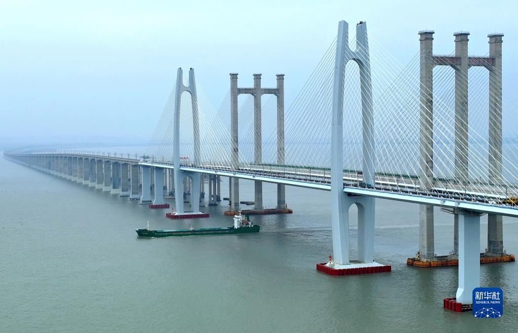 這是2月4日拍攝的新建福廈鐵路泉州灣跨海大橋(無人機照片)。