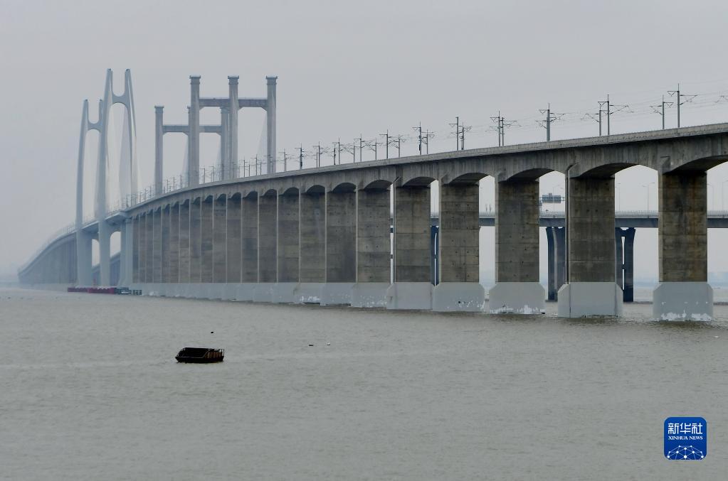 這是2月4日拍攝的新建福廈鐵路泉州灣跨海大橋。